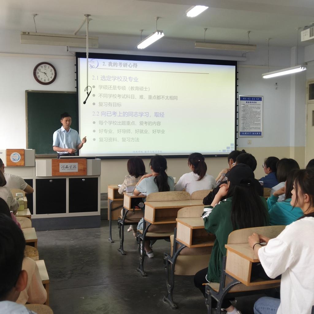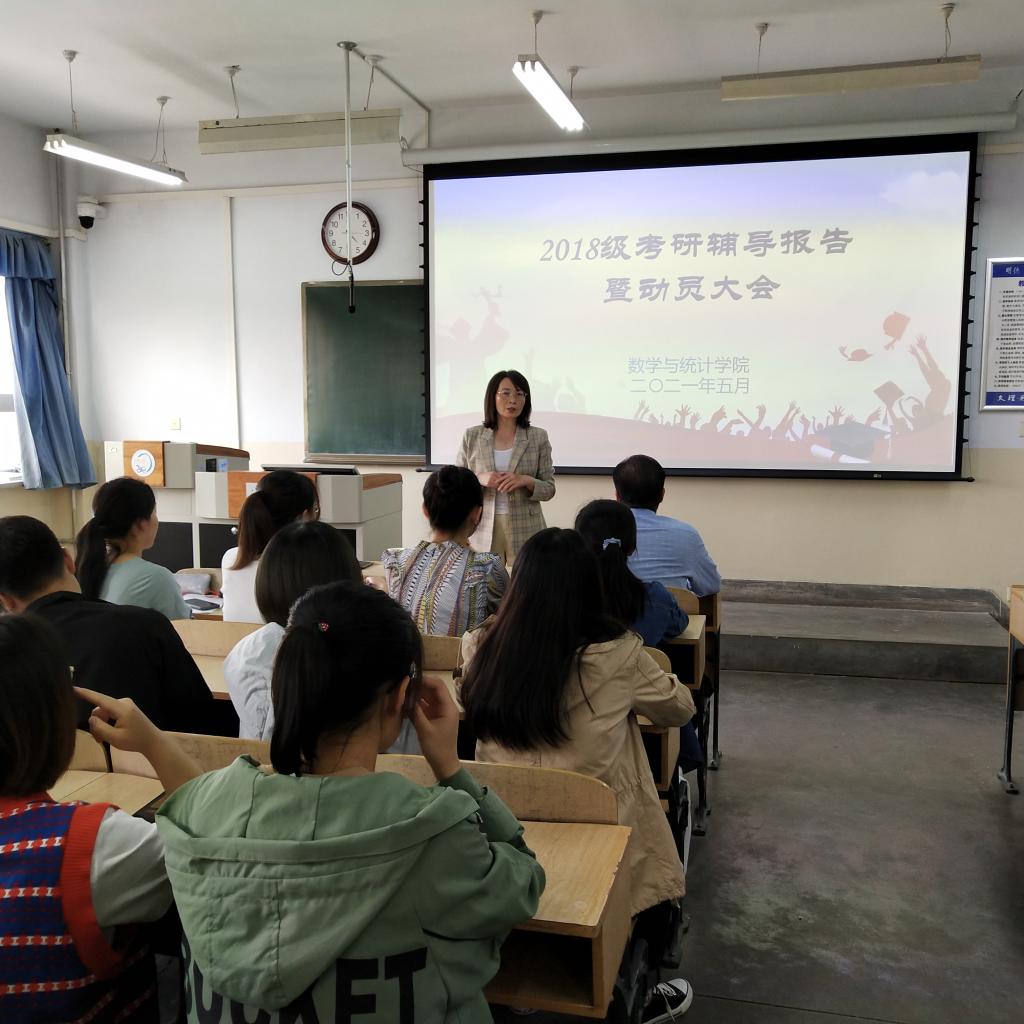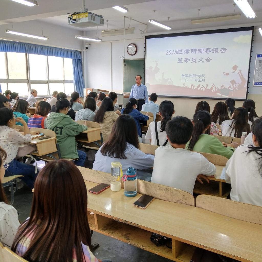 为深入开展“为师生办实事”,进一步帮助学生了解更多考研信息,掌握考研技巧,5月13日,数学与统计学院举行2018级考研辅导报告暨动员大会,邀请学院朱睦正、刘群两位博士作专题辅导报告。学院领导、2018级班主任、辅导员及数学181全体同学参加了报告会。