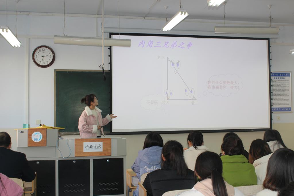 本次活动首先由数学与应用数学2018级1班常元元同学和丁月洁同学展示了课例《三角形内角和定理》和《异分母分数的加减法》的试讲,两位同学准备充分,充分展现了数学师范生的良好素质。大成学校的于海峰老师结合两位同学的课例,详细介绍了如何挖掘教材、如何撰写教案、如何磨课。甘肃省特级教师、思源实验学校的马海霞老师结合教学实际,从课堂导入、学法指导、教学资源的选取等方面对两节课进行了细致入微的点评!