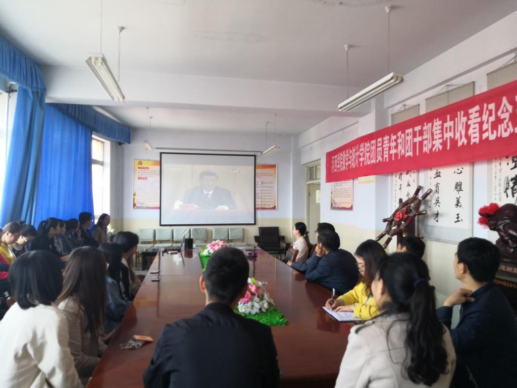 4月30日上午10:30我院领导、教师代表、学生党员、共青团干部等共计40余人在三号教学楼六楼会议室观看了纪念五四运动100周年大会实况直播。
