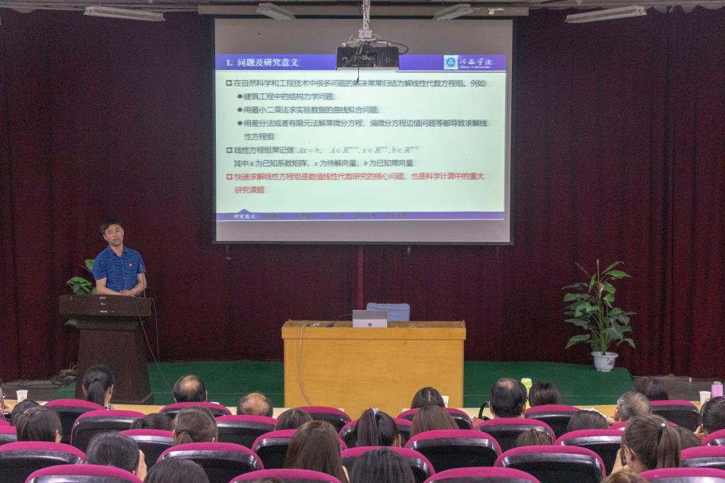 报告会上,朱睦正教授从求解线性方程组Cramer法则和直接求逆的基本想法出发,首先回顾了Gauss顺序消元法、全主元消去和列主元消去法等直接解法和Jacobia、Gauss-Seidel和SOR迭代方法;其次结合自己的研究工作对离散分数阶微分方程产生的大规模线性方程组的求解进行了具体阐述;最后对大规模线性方程组的数值解法进行了前景展望。