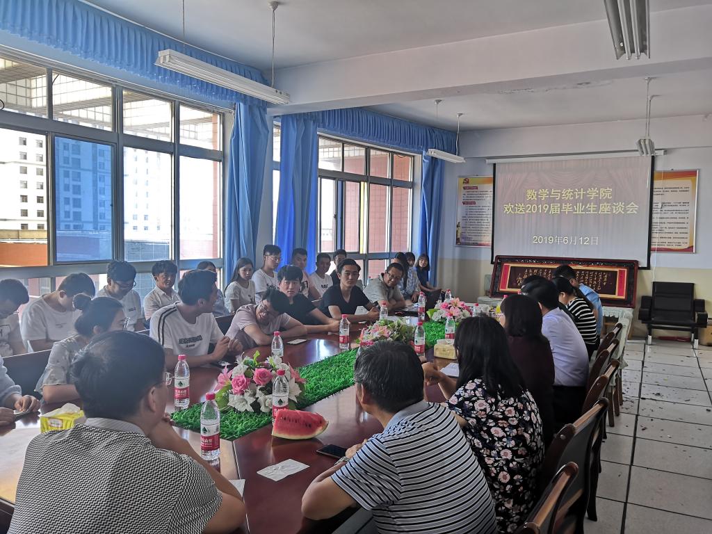 6月12日下午,数学与统计学院2019届毕业生座谈会在三教六楼会议中心召开,院党委书记李拓教授、副院长郭育红教授、副院长朱睦正教授、办公室主任高天丽、各班班主任与毕业生代表进行了座谈交流,2019届毕业生向学院赠送牌匾,表达了对学院老师精心培育的感激之情和对母校的依依惜别之情。