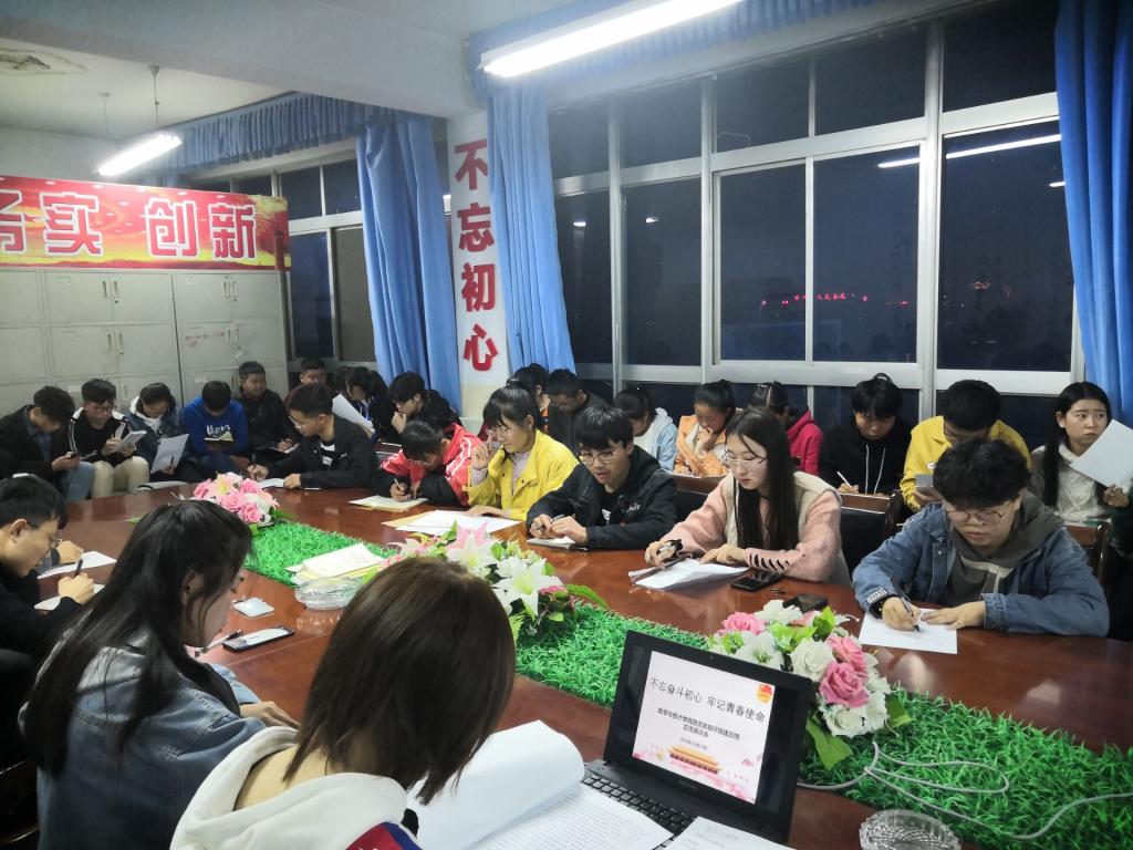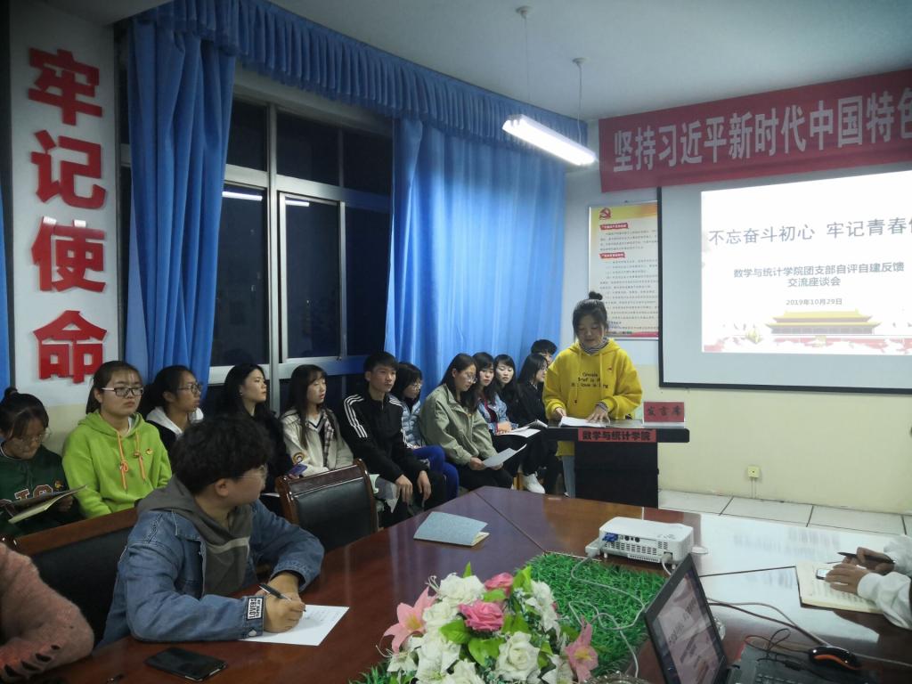 根据校团委“不忘奋斗初心,牢记青春使命”主题教育活动的通知,数学与统计学院分团委紧抓落实,先在各团支部进行自评自查的基础上,于2019年10月29日晚,在三教六楼会议室召开了各团支部反馈交流会,此次座谈会历时两个小时,数学与统计学院各团支部团干部及团员代表参加,辅导员范锐老师和李毛毛老师主持。