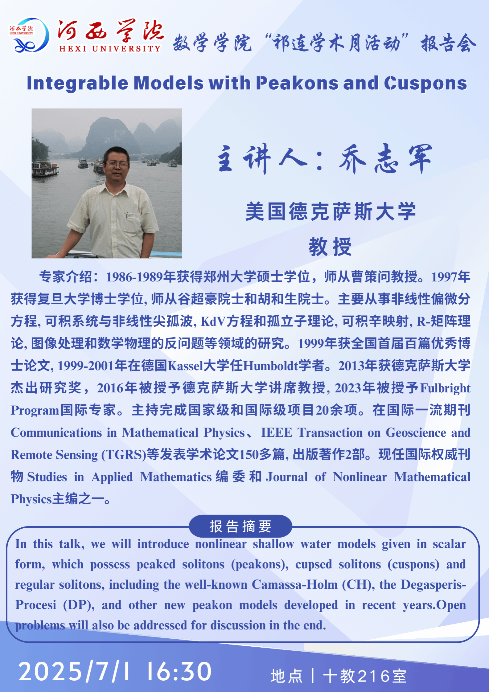 【学术报告】美国德克萨斯大学教授 乔志军 |Integrable Models with Peakons and Cuspons